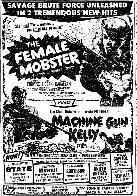 A decade before Arthur Penn’s Bonnie and Clyde, Bonnie Parker got her own biopic in The Female Mobster, which debuted on a violence-packed double bill with Roger Corman’s bloody Machine Gun Kelly. Together they unleashed “savage brute force” across Los Angeles on July 2, 1958.