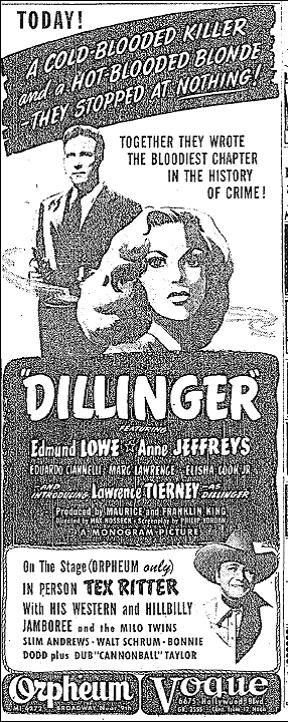 Dillinger, 7-10-1945. “A cold-blooded killer and a hot tempered blonde. Together they wrote the bloodiest chapter in the history of crime.” Also, live on stage, Tex Ritter.