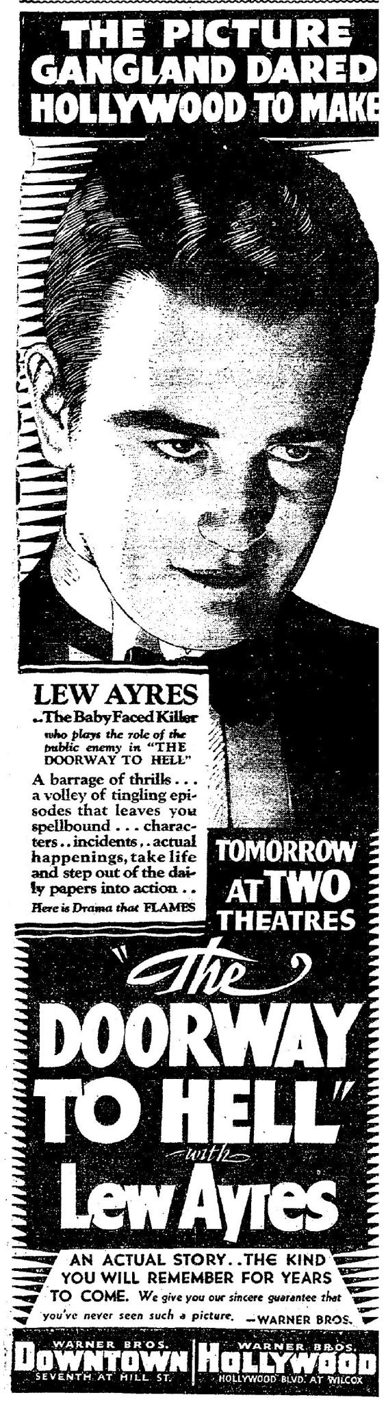 Warner Brothers burst onto the gangster talkie scene in in a big way November 1930 with The Doorway to Hell directed by Archie Mayo. Based on Rowland Brown’s story “A Handful of Clouds” it starred Lew Ayers as a “baby faced killer,” and newbie James Cagney as his sidekick.