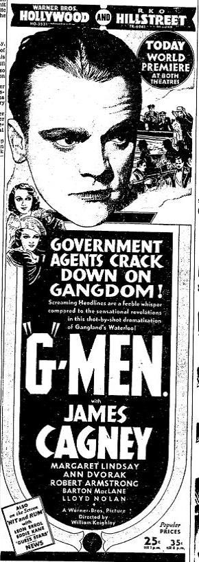 G-MEN, 4-25-1935 “Screaming headlines are a feeble whisper compared to the sensational revelations in this shot-by-shot dramatization of Gangland’s Waterloo!”