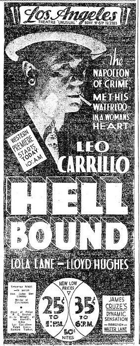 April 1931 saw the L.A. release of City Streets, said to be a favorite of Al Capone, whose days as Chicago’s #1 gangster were limited. Based on a story by Dashiell Hammett, it starred Gary Cooper and Sylvia Sydney in a role that was originally slated for Clara Bow. Hell Bound came to the Los Angeles Theater on April 24 with Leo Carillo playing a “Napoleon of crime” and Lola Lane as his love interest. On May 4, The topical The Secret Six debuted at the Criterion. Taking its title from the Chicago crime committee devoted to bringing down Al Capone, the story was written and adapted by Frances Marion.