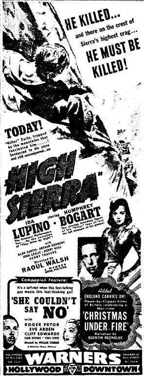 In January 1941 Humphrey Bogart played a Dillinger-like public enemy-era gangster Roy Earle in High Sierra, written by novelist-screenwriter W.R. Burnett. Directed by Raoul Walsh, reviewer Schallert thought the film “recaptures much of the flavor of the author’s Little Caesar and other Warner gangster cinemas.”