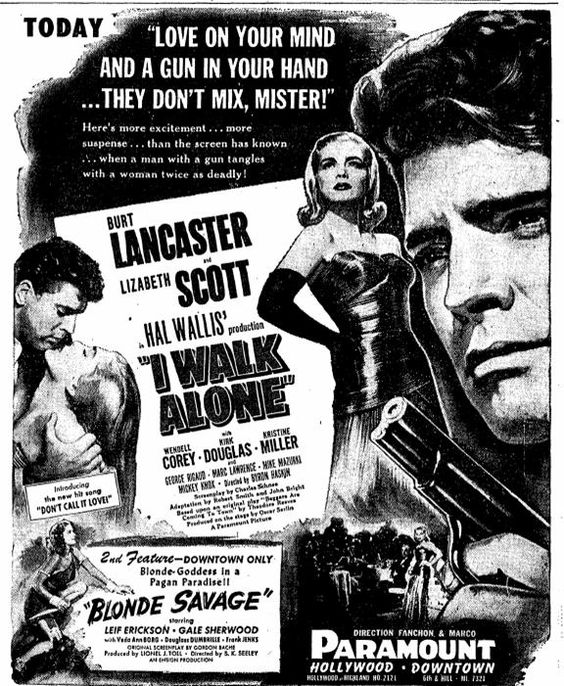 January 1948 saw I Walk Alone with Burt Lancaster and Kurt Douglas as prohibition-era beer bootleggers who meet up again after 14 years. Burt took the wrap for a liquor beef while Kurt thrived as a successful gambling house owner in post-Repeal world. It is usually classed today as a film noir.