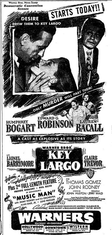 Key Largo opened in L.A. theaters for the first time in July 1948. Starring Bogart, Lauren Bacall, Edward G. Robinson and Claire Trevor, reviewer Schallert said it “sets off the fuse that ignites the powder keg of a vigorous gangster movie” noting that Robinson “succeeds in reviving his Little Caesar with tremendous effect.”