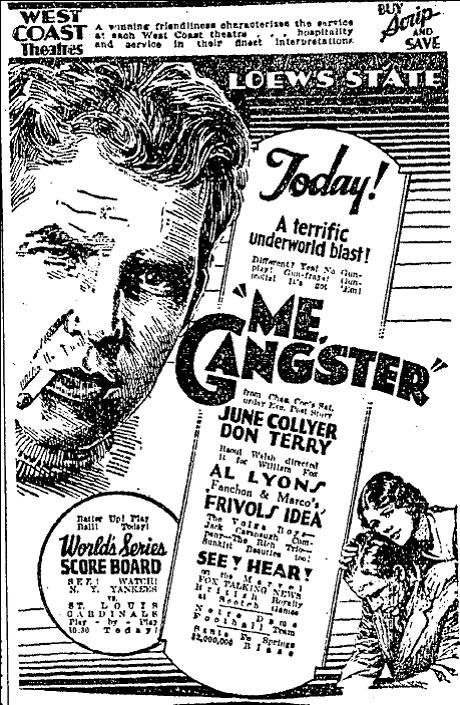 In October 1928, Raoul Walsh’s Me, Gangster opened at the Loew’s State Theater. The picture, based on a Saturday Evening Post story by Fox screenwriter Frances Coe, was already considered “different” in that it did not depict now-typical, if silent, machine gun blasts and murders.