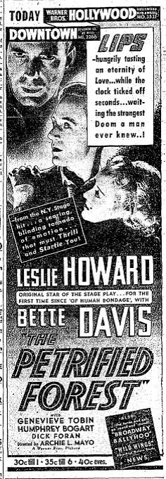 In 1936, Humphrey Bogart reprised his stage role as Dillinger-like gangster Duke Mantee in a film adaptation of Robert E. Sheerwood’s 1935 play The Petrified Forest with Bette Davis and Leslie Howard. Bogart’s fatalistic gangster on the run is not unlike doomed film noir anti-heroes to come.