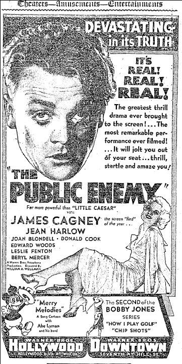 May 15, 1931 was the Los Angeles premiere of Warner Brothers’ The Public Enemy, a Cain and Abel type gangster story directed by William Wellman, with James Cagney as a bootlegger, contrasted with his brother who chose a different path. Mae Murray (who famously gets a grapefruit in the face from Cagney in the film) and Jean Harlow also starred.