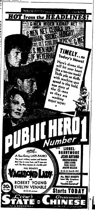 Public Hero Number 1, 6-20-1935. “Timely as today’s news! Here’s the drama that will hit your heart like a ten-ton truck! Thrills pile on thrills with machine gun speed in this bold, true story of the G-men as they are working Right Now!”