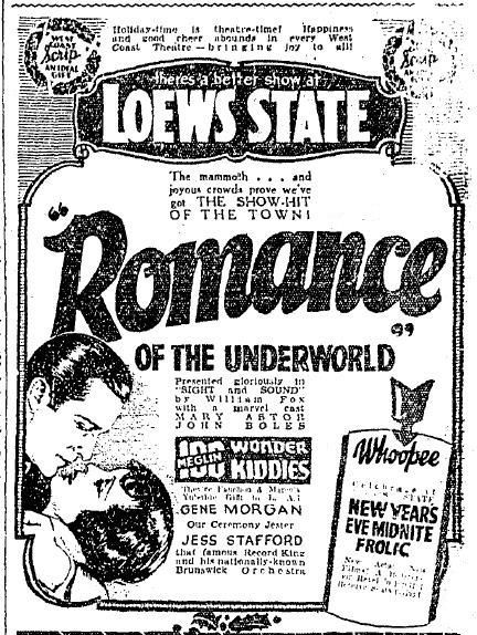 Christmas week 1928 brought Romance of the Underworld to Loew’s State. Directed by Irving Cummings, with Mary Astor and John Boles starring, it was based on a stage play of the same name and had already been filmed once before, in 1918. Though generally pleased with the movie, reviewer Busby complained that “underworld pictures are beginning to repeat characters, plots and incidents. To the constant filmgoer, the underworld must be as familiar as the family bathtub.” He suggested that producers making their New Year’s resolutions for 1929 might want to swear off making more underworld pictures.