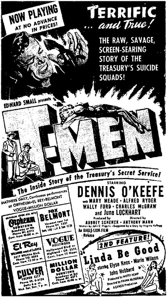 T-Men debuted in February 1947 with Dennis O’Keefe, an updated version of the G-Men films a decade earlier.