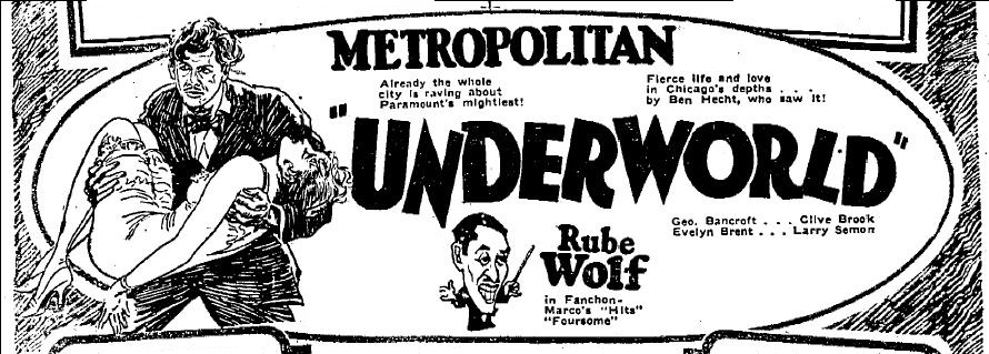 Underworld (1927) written by Ben Hecht and directed by Josef von Sternberg, is often cited as the first “modern” gangster film. Los Angeles Times review Marquis Busby called it one of the best crook melodramas to reach the screen. “If the baby has to go barefooted this winter, if the roof leaks like a sieve, and even if the lizzie needs gasoline, dig down into the jeans and go see Underworld” he advised. A “silent” film, it starred George Bancroft as gangster “Bull” Weed (a fictionalized version of escaped Chicago gangster “Terrible” Tommy O’Connor) with Evelyn Brent as his moll “Feathers” McCoy.