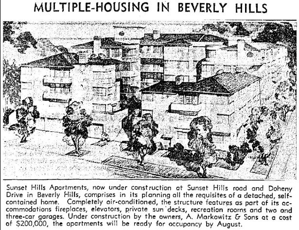 He may have had in mind thislate 1930s streamline moderne apartment building at 9231 Doheny Drive, just above the Strip, which had 16 units in separate buildings connected by a patio as described in the novel.
