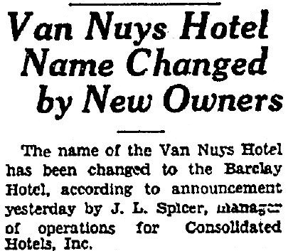 In the novel, Marlowe goes to the “Van Nuys Hotel.” In keeping with Chandler’s tendency to give fictional names to real places, there was no Van Nuys Hotel in 1949 Los Angeles, but there had once been. It opened in 1897 at the corner of Fourth and Main Street downtown. In 1929, twenty years before The Little Sister’s publication, it was renamed The Barclay.