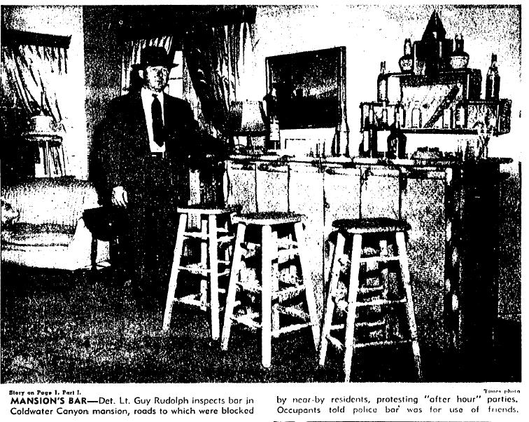 “I carried the glass and bottle of brandy over to the bar and climbed over it. I rinsed the glass in a little sink and set the bottle back on the shelf.” Chandler writes in The Little Sister. Det. Lt. Guy Rudolph at the bar of 9100 Haven Drive. LA Times. 4/18/1944