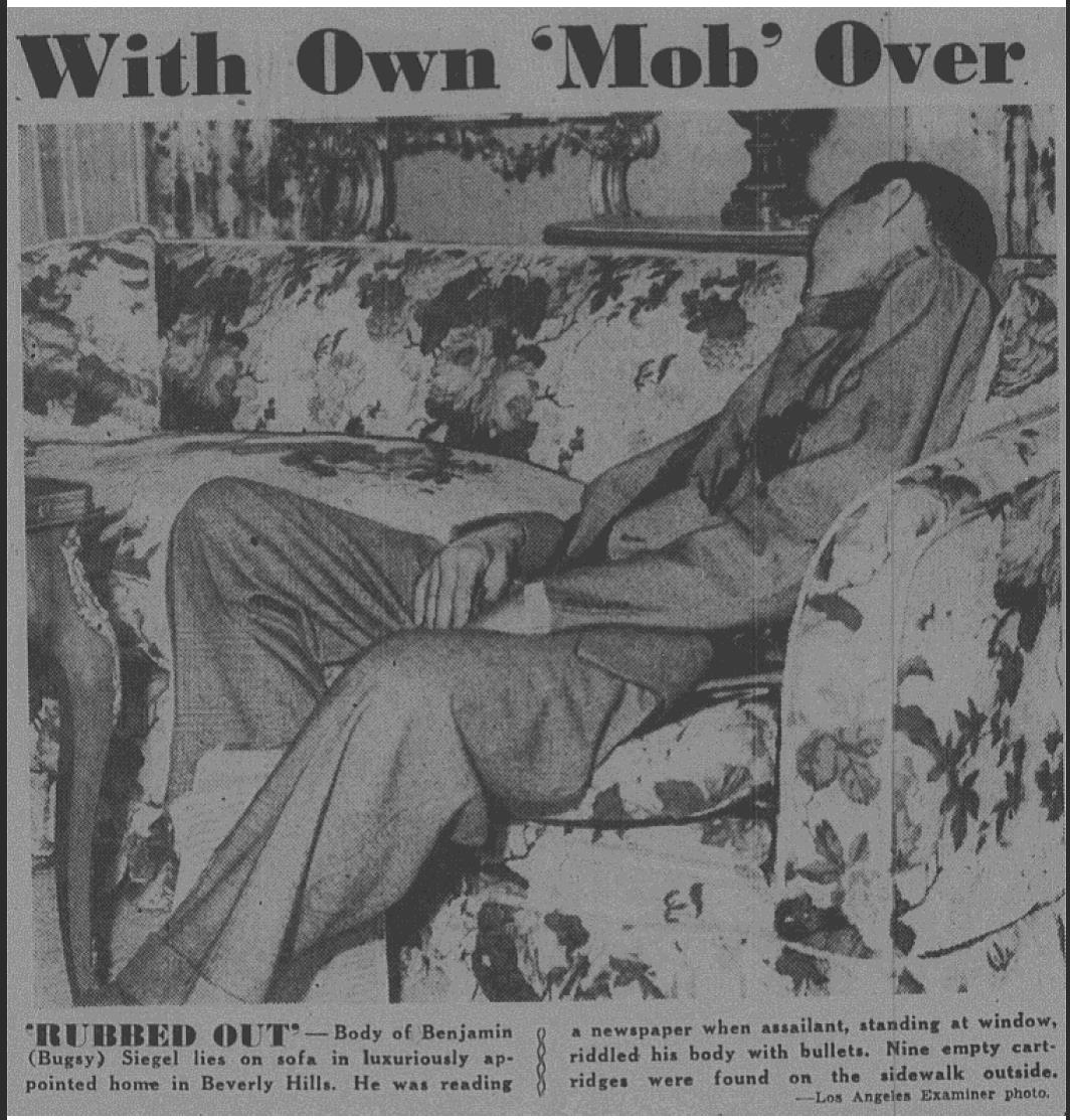 “Try that chair with the magnolias on it,” she said. In The Little Sister, Steelgrave’s end, in a floral chintz-covered chair, also recalls Bugsy Siegel. He was shot to death in June 1947 on the chintz-covered sofa in yet another Beverly Hills mansion. LA Examiner 6/21/47