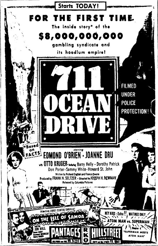 711 Ocean Drive debuted in Los Angeles Area theaters on July 20, 1950. Longtime LA Times film critic Edwin Schallert noted the “somewhat documentary” nature of the picture, which he called a “good sound melodrama with a surprising amount of excitement.” It is mostly notable for its many Los Angeles location shots.