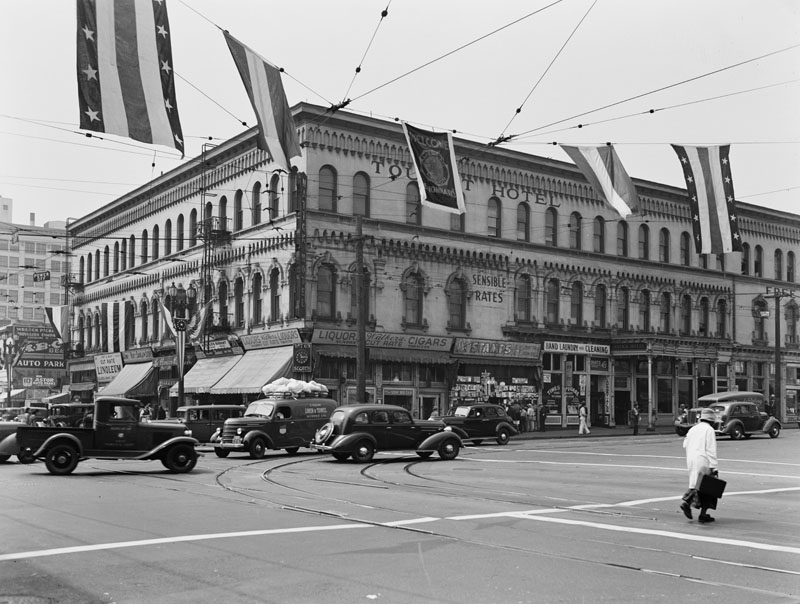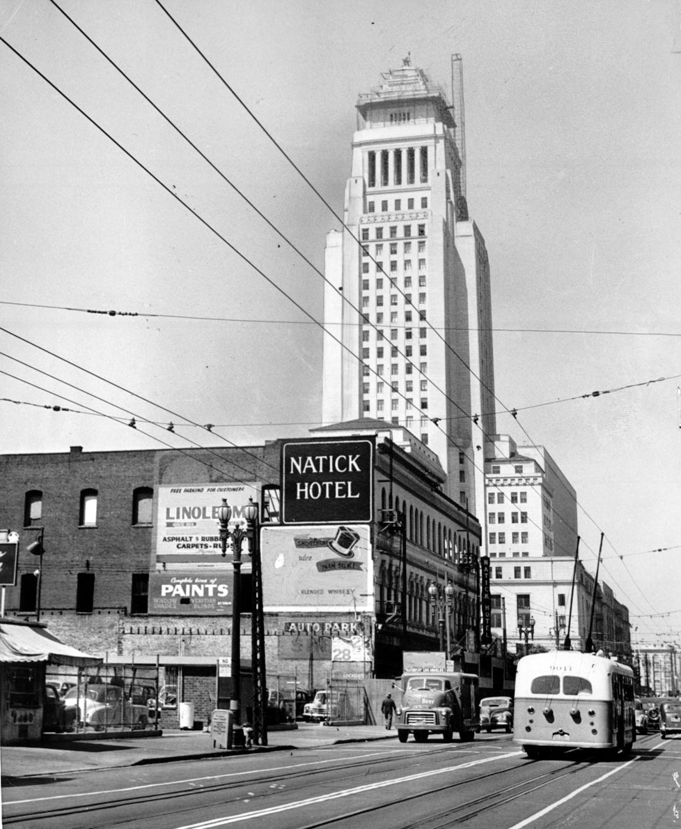 Screen capture from 711 Ocean Drive, looking south on Main Street on a typical smoggy day, from City Hall (at right). The building on the SW corner of First & Main is one of the last glimpses of the Natick House Hotel, demolished in July 1950 shortly before the film came out. The 10-story building is the 1909 Higgins Building at Second & Main. In the murky distance, the Rosslyn Hotel, with its giant roof sign, can be seen at Fifth & Main. Both the Rosslyn and the Higgins Building are still there.