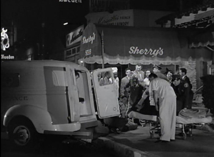 The July 19, 1949 Cohen shooting outside Sherry’s on the Sunset Strip is depicted in 711 Ocean Drive in a brief montage sequence. The above screen capture from the film is identified on some corners of the internet as the actual Cohen shooting.