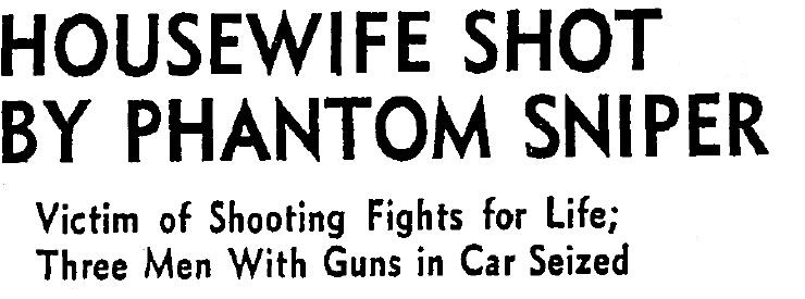 The first two mystery shootings barely made the news. The evening of August 27, 1951, 21-year-old housewife, Lois Kreutzer, was calling a doctor about her sick infant from a phone booth near her home in semi-rural Pico Rivera when a bullet shattered the glass, striking Mrs. Kreutzer in the left lung. She was taken to the hospital in critical condition. The bullet had been fired from a 22-caliber rifle by an unidentified person.