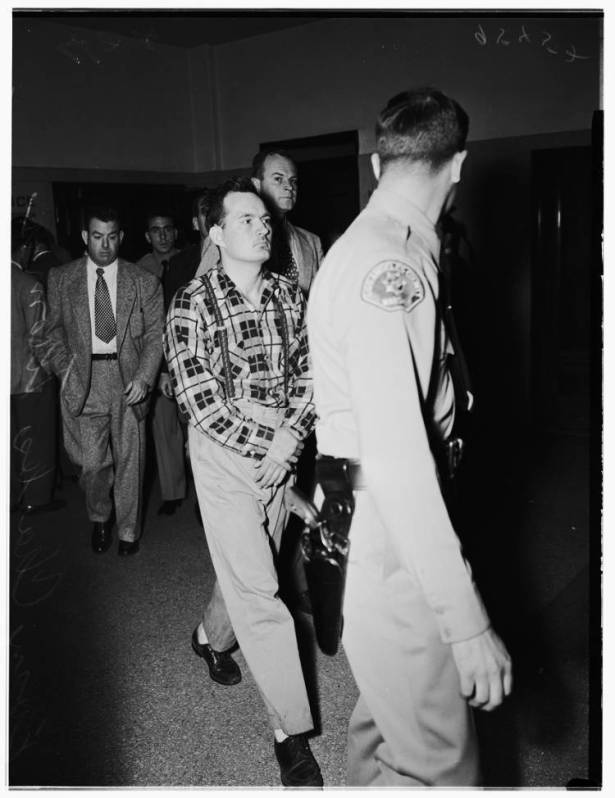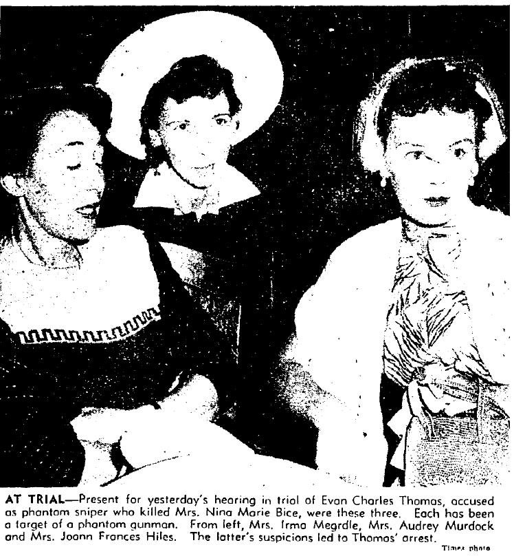 Originally from Ohio, Thomas, who was in his late 20s, had come to California while he was serving with the Air Force. He now worked as a railyard switchman. Far from a moody loner, he was married, with two young children and another on the way. When his wife left to visit her mother on August 27, 1951, he felt “at loose ends” he said, so he grabbed the rifle and went driving around. He spotted Lois Kreutzer in the phone booth and took a shot at her “on impulse,” hiding among a stand of avocado trees to get a bead on her. He described lurking in an orange grove across from Irma Megerdle’s before shooting her, and spotting Nina Bice at the hot dog stand. He admitted shooting up the Walter house, and firing on Patricia Bryant and Audrey Murdock. “I just drove around and picked them at random,” on his way to work or on household errands he said, admitting the selection of victims was “erotically motivated.” Later the same day he led D.A. investigators and sheriff’s officers on a tour of the locations.
