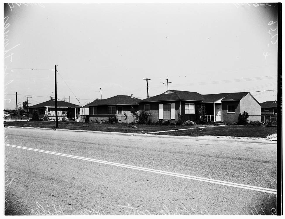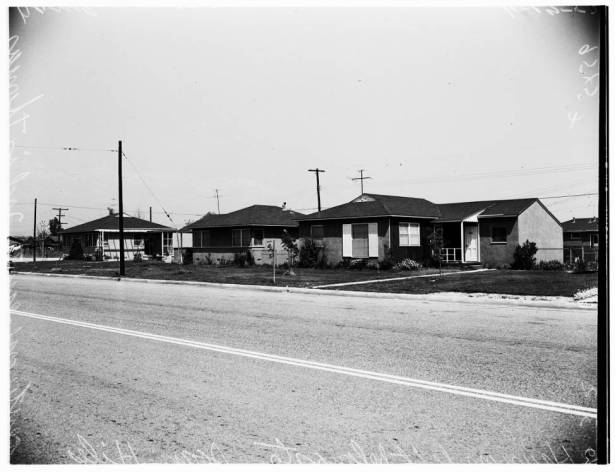 Thomas told authorities he leaned on rail of an empty home, 9410 Pioneer Boulevard, to fire into the home of his neighbor, Joann Hines at 9402 Pioneer Boulevard. Thomas’ own house is on the right. UCLA Herald Examiner collection.
