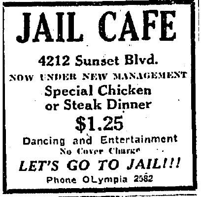 The original Jail Cafe on Sunset lasted longer, through March 1930. By then the mood of the country had shifted; the whoopee spirit and the novelty of lawlessess had worn off. By January 1933, 4212 Sunset had been converted into the Gateway Theater, which lasted through the 1950s. As of 1963, it was operating as El Cid.