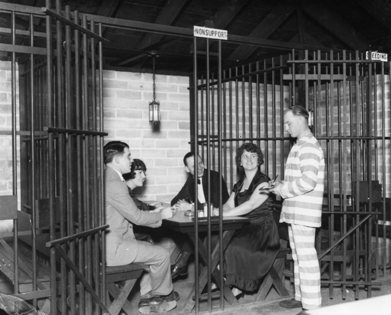 The clink-themed Jail Cafe opened at 4212 Sunset Boulevard in September 1925 as gangland violence was reaching it’s peak. The building, constructed over the summer, was designed by architect A.F. Leicht to resemble a stone jail structure complete with watchtower; inside patrons could gather around a large cozy fireplace or be served in private “cells” by waiters dressed as convicts.