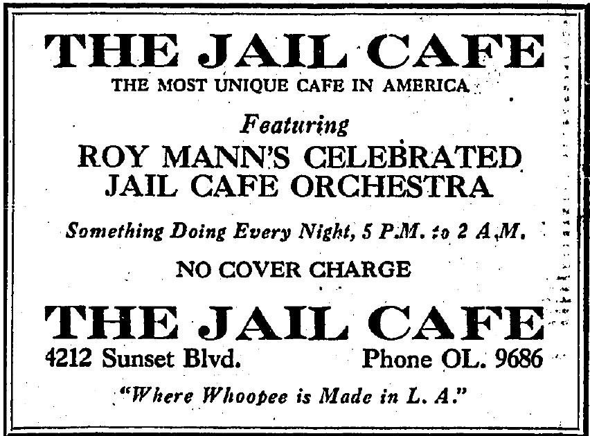Proprietors Louis Bedford and H.N. Denny planned to build a chain of such novelty cafes, but only one other was opened in Los Angeles, the short-lived 6th St. Jail Cafe at 1207 W. Sixth St. in the Westlake district. The 6th St. Jail grand opening was held March 6, 1926, but a hitch in obtaining its dance permit necessitated a second “grand opening” on June 26, 1926. By November 1927 it had become The Moulin Rouge, operated by Fred Harlow.