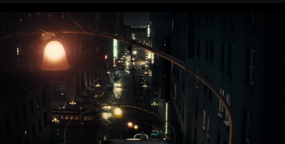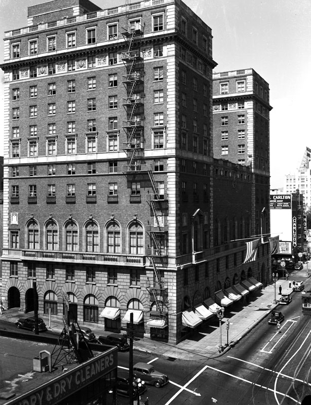 HBO’s Perry walking north on Main St., passing the Regent Theater at 448 S. Main. The Rosslyn and Rosslyn Annex can be seen behind him. The web of overhead wires were for the streetcar systems.