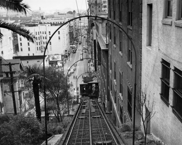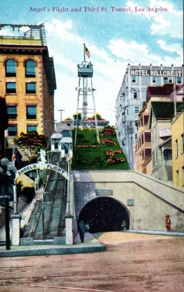 The funicular railway opened in 1902 next to the 1901 Third Street Tunnel. It climbed Bunker Hill from Hill & Third to the upper terminus at Olive Street. The railway closed in 1969 and was stored until being reassembled at a new location a block south of the original.