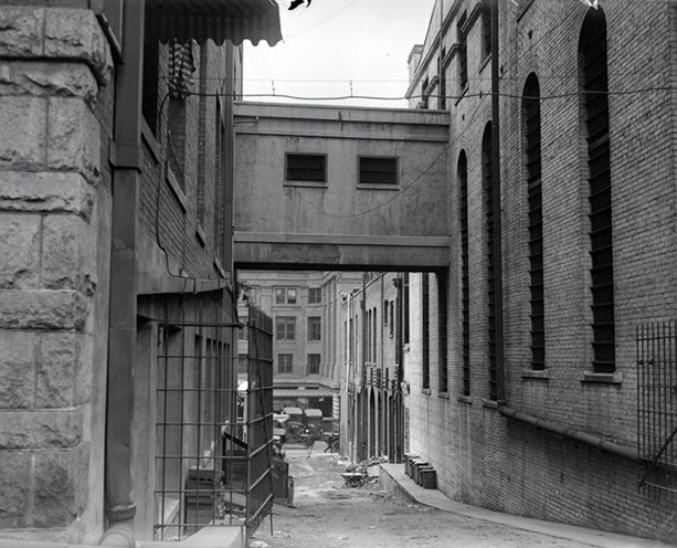The “Bridge of Sighs” connecting the old LA City Jail (brick structure on the right) to Old Central police station on First St. View is looking east toward S. Broadway. LAPL.