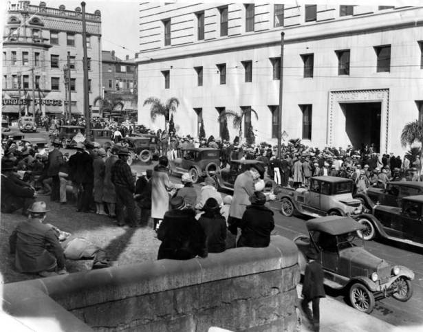 A crowd outside the Hall of Justice during the Hickman trial in 1928. Spectators are positioned on the grounds of the County Courthouse. The building in the upper left was the WCTU headquarters. LAPL.