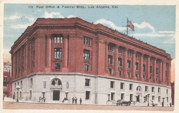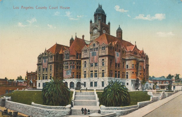 Postcard view of the 1891 red sandstone LA County Courthouse on Poundcake Hill, before its clock tower was demolished and prior to the construction of the Hall of Records.