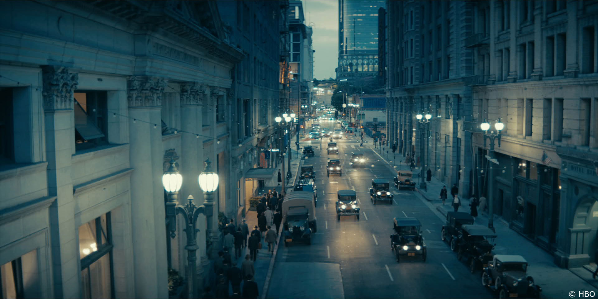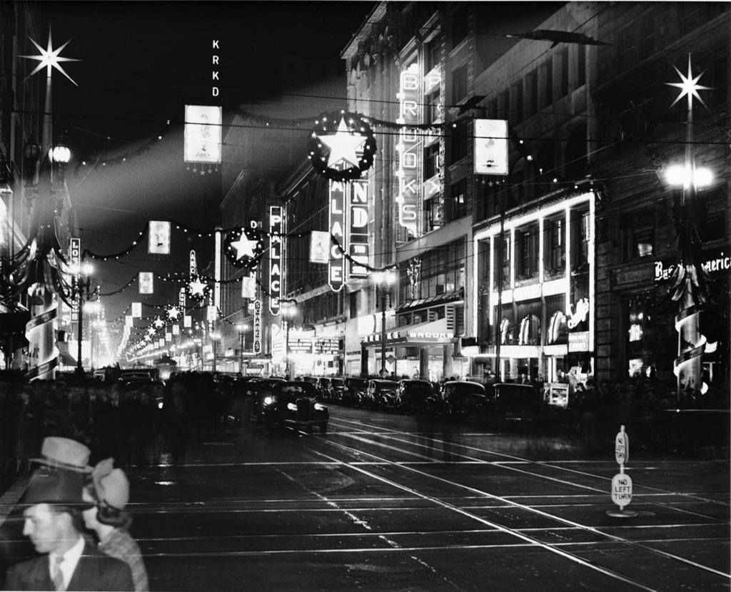 The downtown street decorations seen in the 2020 Perry Mason are typical of those seen in early 1930s Los Angeles.