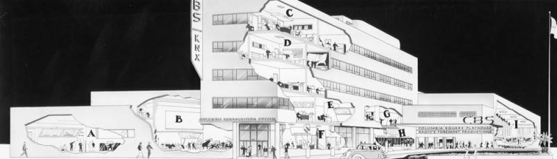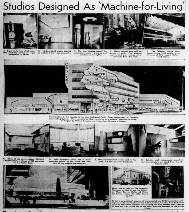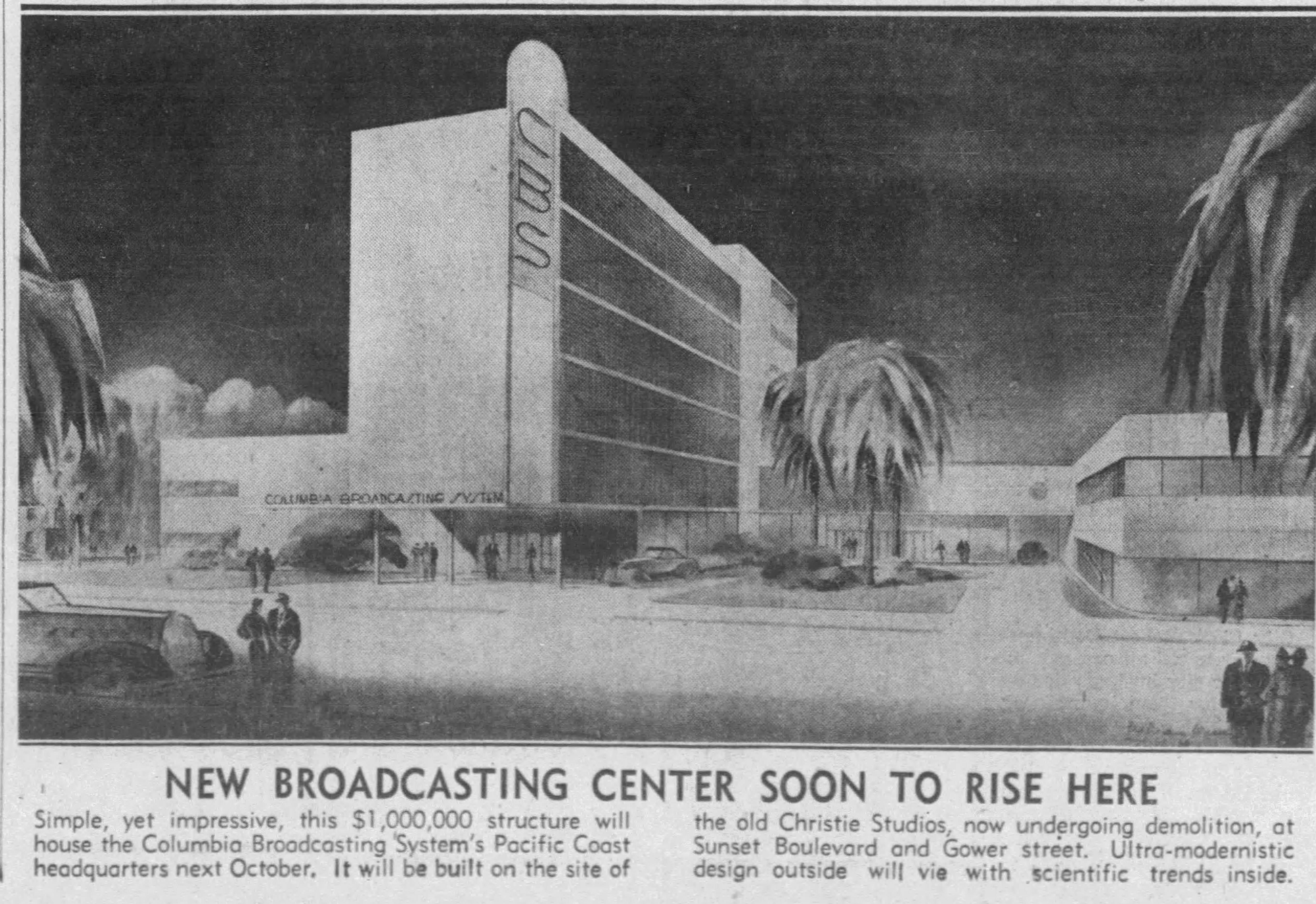 On October 16, 1936, local papers reported that CBS was planning a $1 million new home, revealed by Donald Thornburgh, CBS VP in charge of Pacific Coast operations. Having seen that the competition, NBC, was already outgrowing its new Hollywood home on Melrose Avenue, CBS was going big- huge even. The location was to be the north side of Sunset between El Centro and Gower streets. William Lescaze was to design the building; Earl T. Heitschmidt of Los Angeles would be in charge of the actual construction.