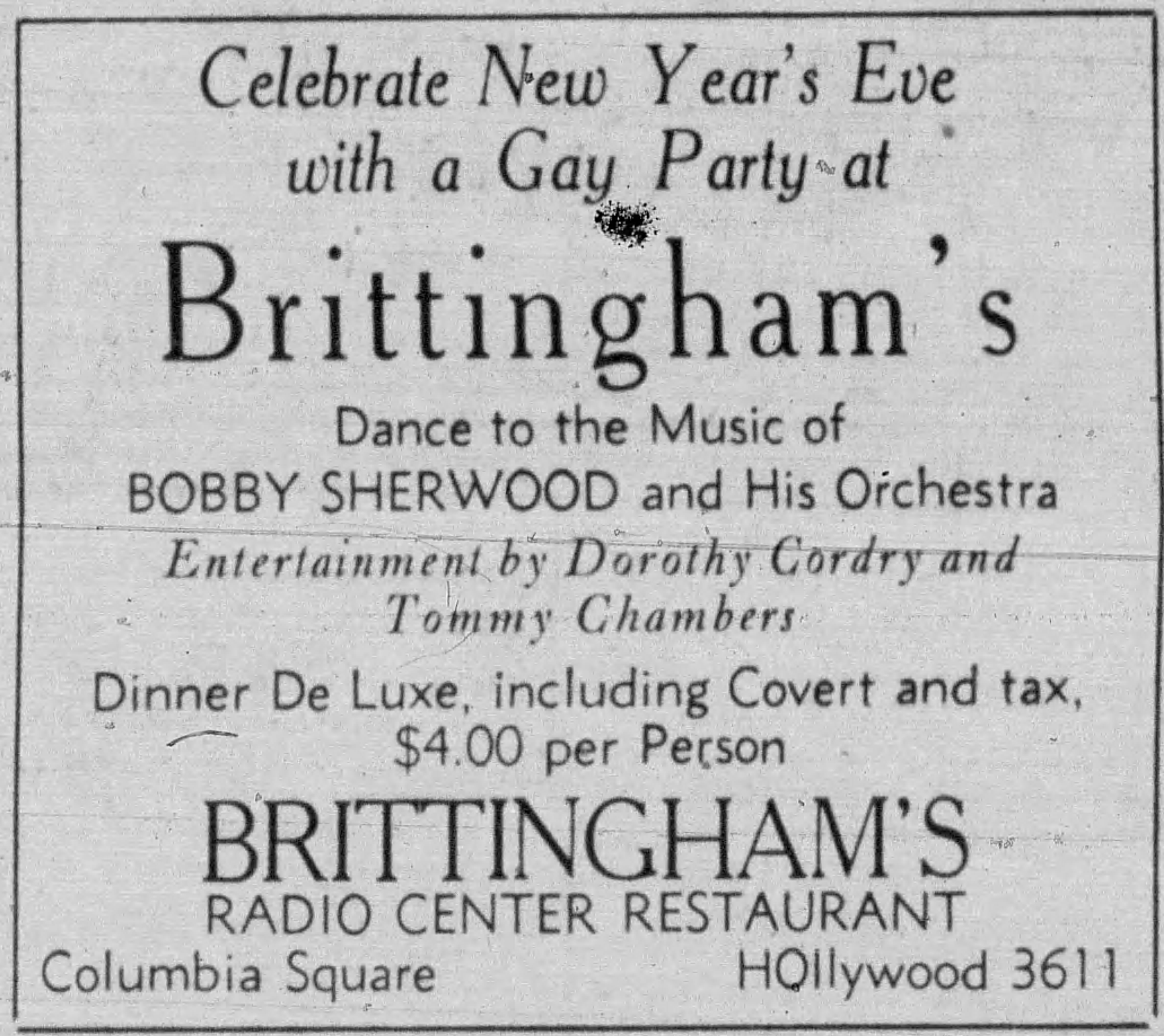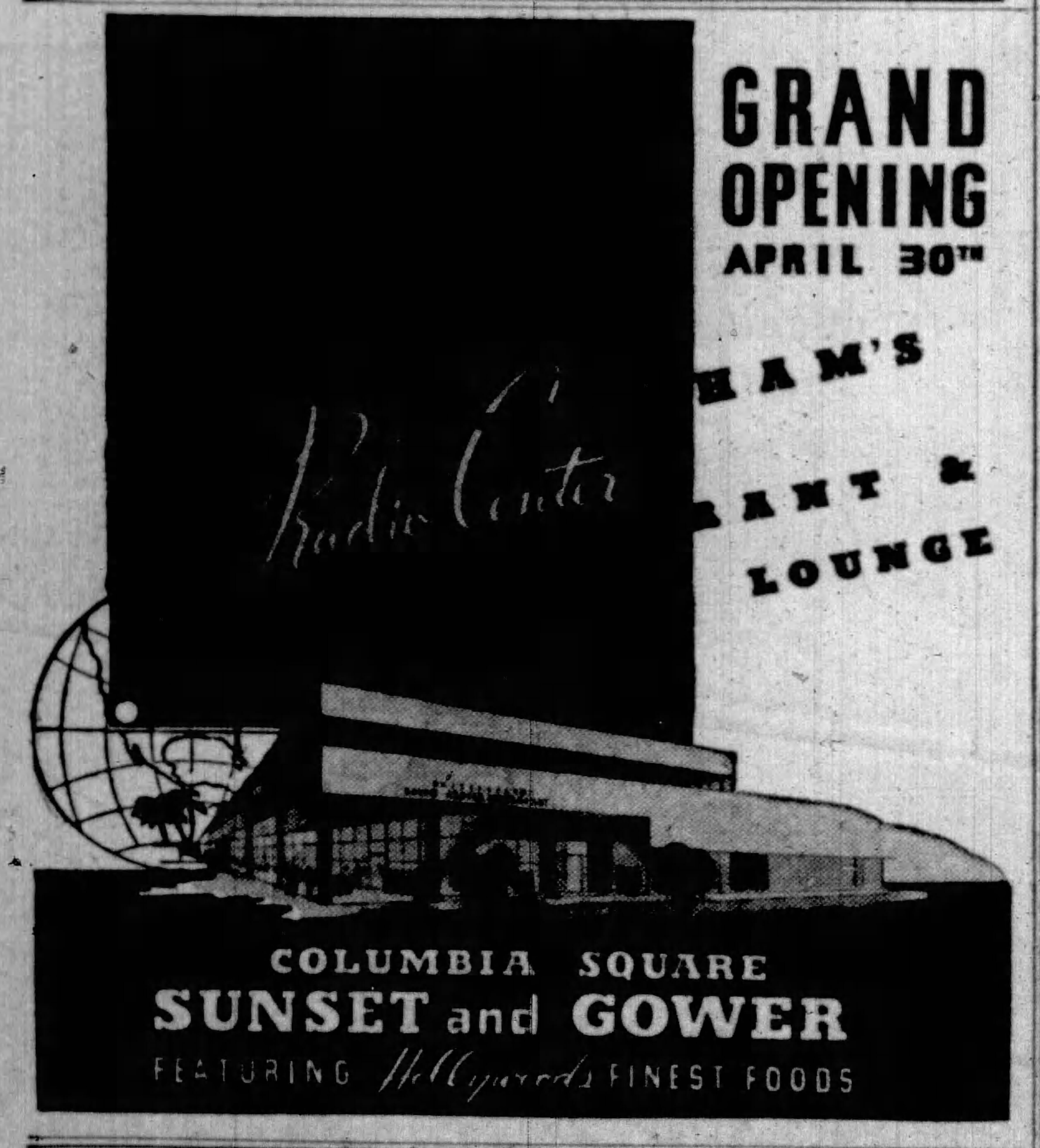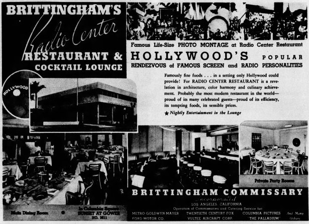 Ad for the grand opening of Brittingham’s Radio Center Restaurant. 4/29/1938. Hollywood Citizen-News.
