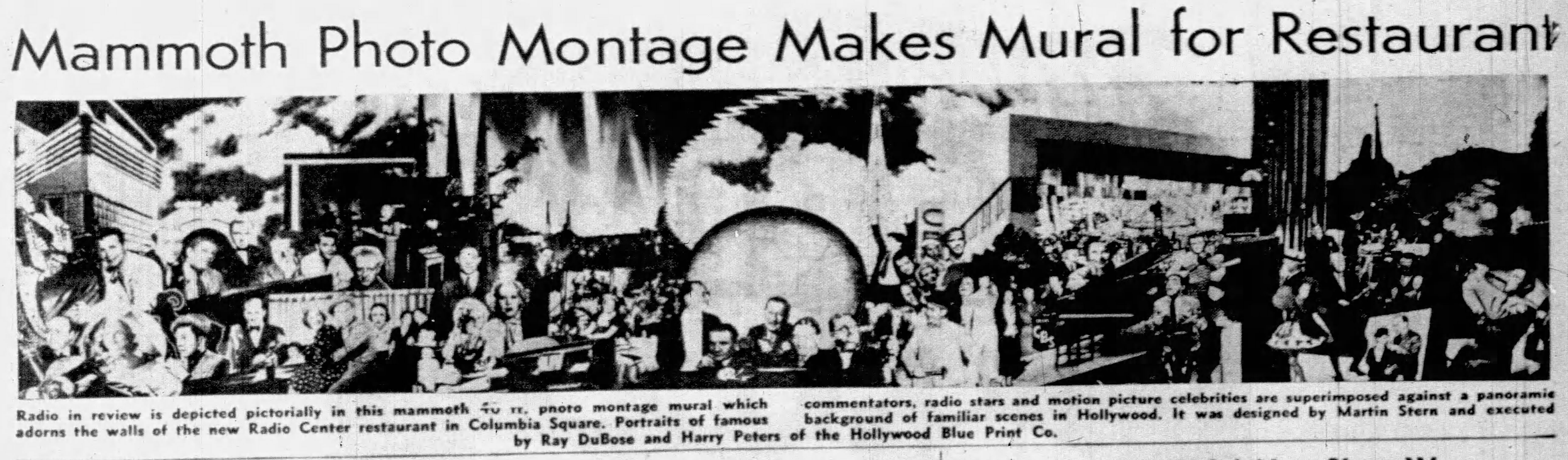 The interior features a “radio in review” photo montage mural depicting radio personalities, designed by Martin Stern wnd executed by Ray DeBose and Harry Peters of the Hollywood Blueprint Co.