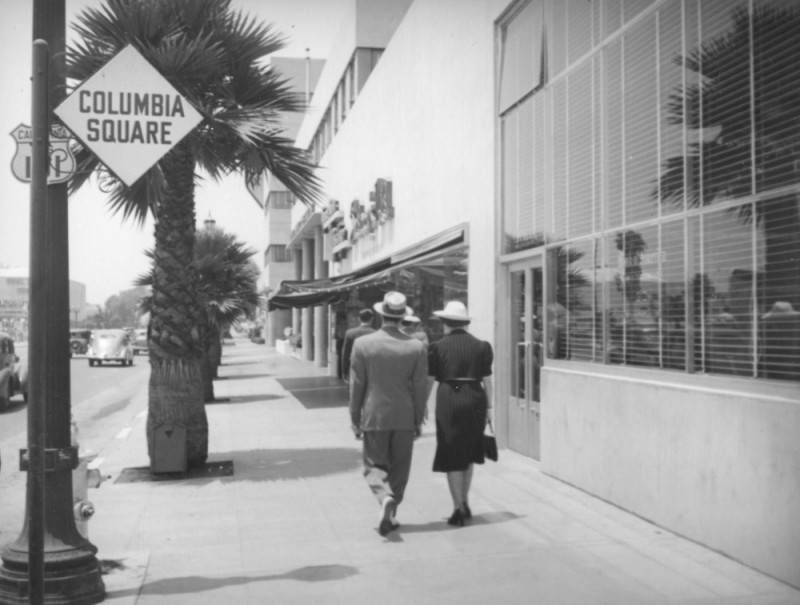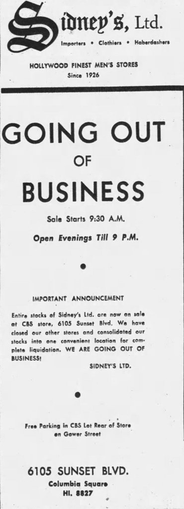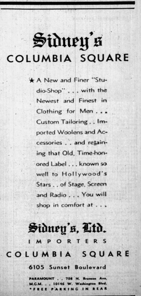 Also opening April 30, 1938 was an outlet of J. Sidneys Sidney’s, Ltd. menswear shop. “Sid’ had opened his first shop at Fox in 1929. In 1938 he operated shops at Paramount and at MGM. The Columbia Square shop, addressed as 6105 Sunset Boulevard, would be his third. The MGM shop would later close and one at Hollywood and Vine.