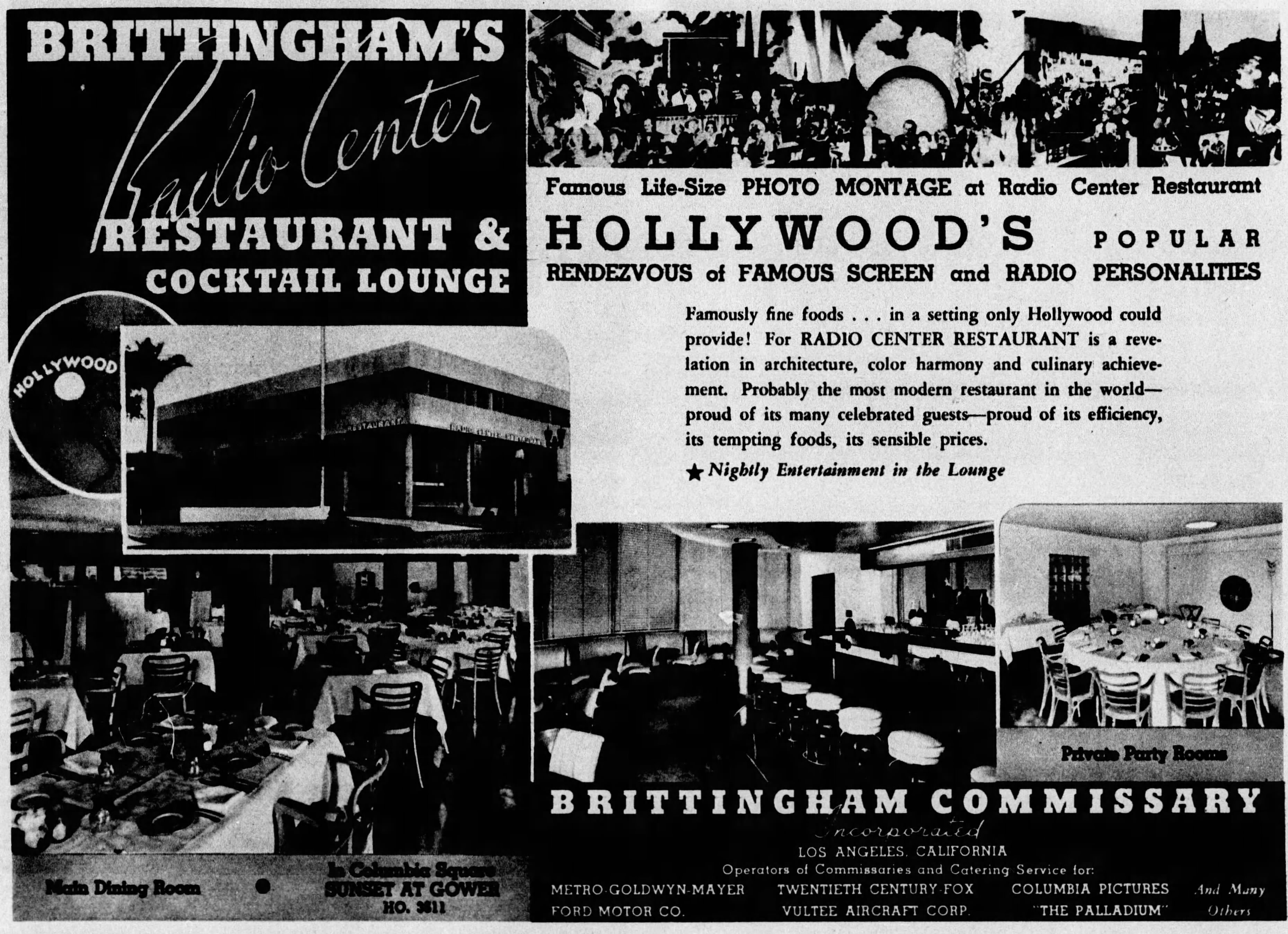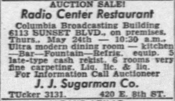 Harry Brittingham Radio Center Restaurant, addressed as 6111 Sunset and later 6113 Sunset, served as both a commissary for station employees and open to the public. It held its grand opening at the same time as CBS: April 30, 1938.
