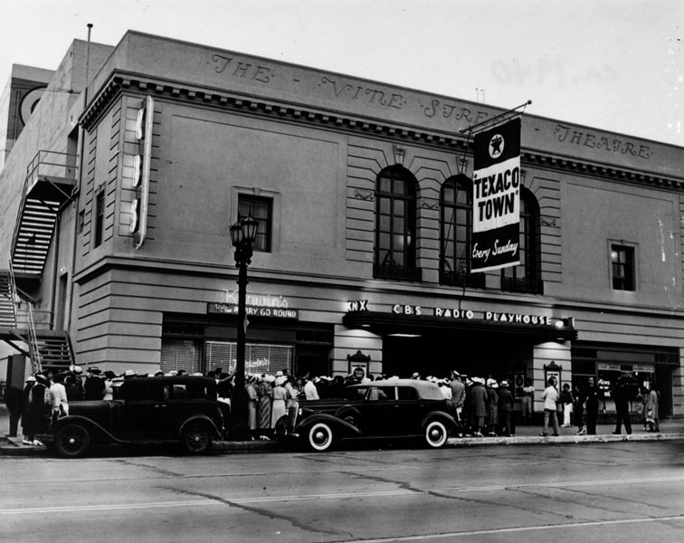 By 1936, CBS was expanding it’s Hollywood presence, broadcasting from various leased theaters including the Figueroa Playhouse at 940 S. Figueroa St. (now the Variety Arts Theater) in downtown Los Angeles, the Wilshire Ebell Theater, The Music Box Theater at 6626 Hollywood Blvd., and the Vine Street Theater at 1615 Vine St., which it renamed CBS Radio Playhouse (now the Ricardo Montalban Theater). CBS continued to use the latter space until 1953.