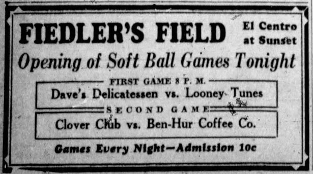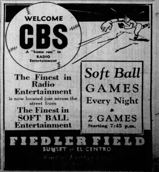 Martin “Marty” Fiedler, the “Zeigfeld of softball” operated Fielder’s Field ballpark, located at the southeast corner of Sunset Bouevard and El Centro Avenue (addressed as 6134 Sunset Boulevard) from 1935 to 1938.