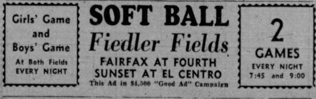 In February 1937, Fiedler announced he was opening a second $15,000 softball park on Fairfax Avenue and Fourth Street. Modeled after the Sunset Boulevard park but with more seating (it could hold 5000), the gala opening was held on April 5 1937.