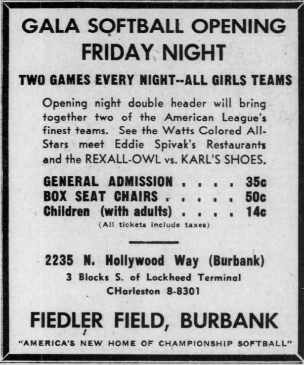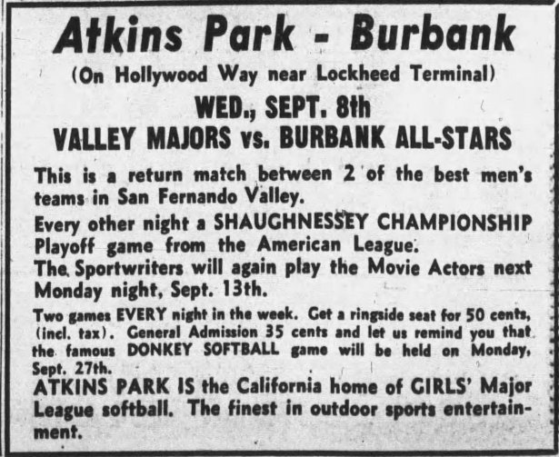 Marty Fiedler joined the Navy after Pearl Harbor and in 1942 was directing sports activities at the US Naval Training Station in San Diego, helping organize the base’s baseball team, among other duties. After the war, in 1947, again teamed with Ruby Sorber as well as Griffith Park club concessioner Wilson Atkins, he announced that he was building a new softball park to be called Fiedler’s Field, in Burbank near Lockheed, addressed as 2235 N. Hollywood Way. It opened on June 11, 1948 as Fiedler’s Field. Later that summer, the name was changed to Atkins Park and, in 1952, to Burbank Stadium.