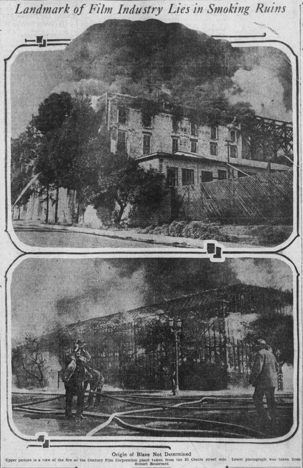 Destruction of Century Film Corp.’s Sunset Boulevard studios. The lower image was taken at Sunset and El Centro where Fiedler’s Field would later rise. 8/16/1926. LAT