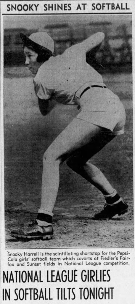Dorothy “Snookie” Harrell at Fiedler’s Field, 1938. An LA native, she went on to play for the All-American Girls Professional Baseball League’s (AAGPBL) Rockford Peaches. 4/10/1938 LAT.