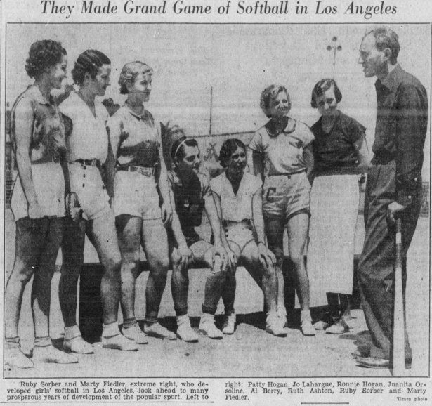 Fiedler, with help from Ruby Sorber, a former player and promoter of womens’ softball, began to foccus on womens’ teams. In the summer of 1935 he had 8 womens’ teams in addition to a dozen mens’ teams. They were not the first womens’ softball teams in Los Angeles, but Fielder helped popularize the sport locally.