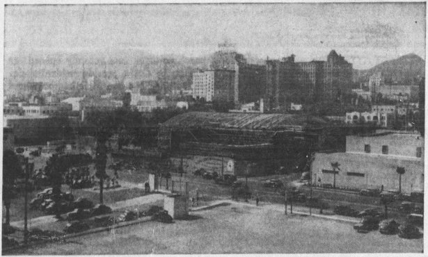 An August 1940 photo of the Sunset & El Centro intersection during construction of the Hollywood Palladium at 6215 Sunset shows a surface parking lot where Fiedler Field had been. 8/25/1940. LAT.