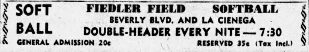 On April 1, 1941, Fieldler announced that he was moving his field from the Fairfax location to a new spot at La Cienega and Beverly Blvd near Third Street. The new softball park, once again called Fiedler’s Field, held its first game of the season on April 20, 1941.