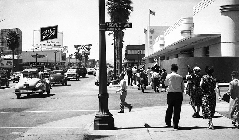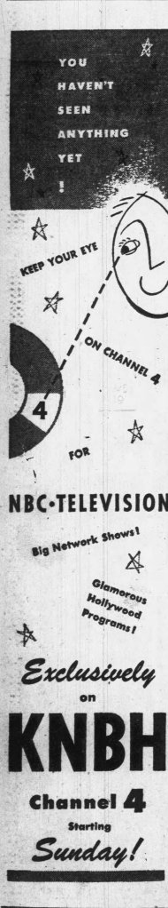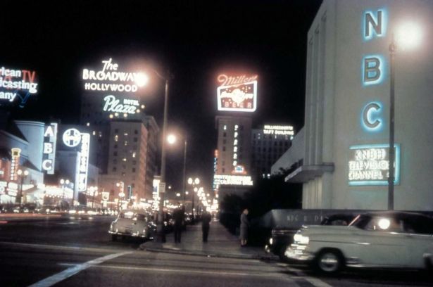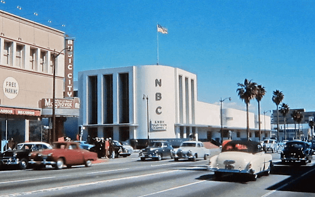 By the late 1940s, like CBS down the street, NBC was struggling to find the room to expand its television operations. As it had in the early days of radio’s westward expansion, NBC leased theaters around town for extra space. In October 1948, the station was getting ready to house NBC’s western television headquarters and for KNBH, which was already showing an experimental test pattern on Channel 4, to be on the air soon. On January 16, 1949, KNBH Channel 4 began broadcasting in Los Angeles. Signage was added to the facade of NBC at Sunset and Vine.