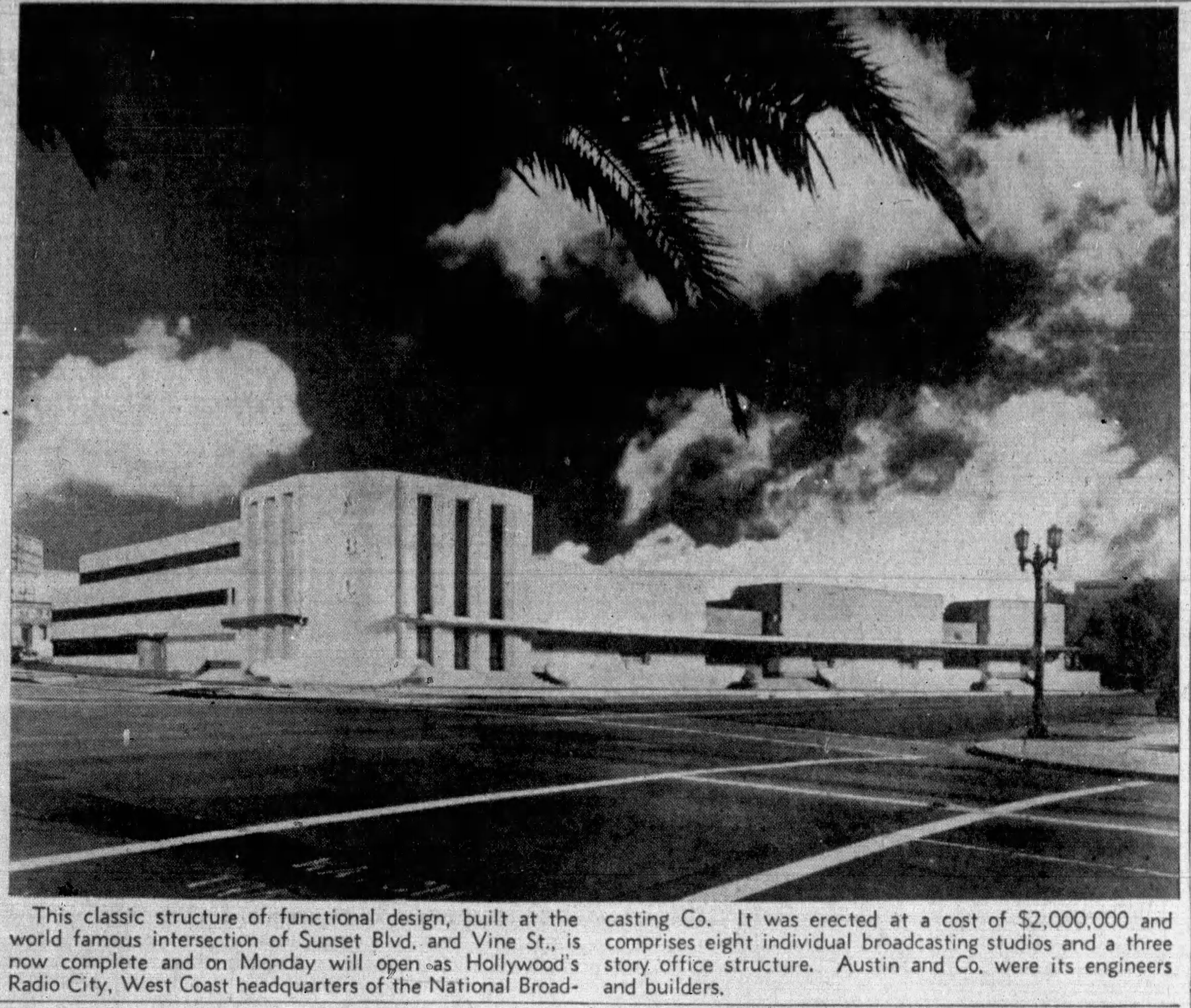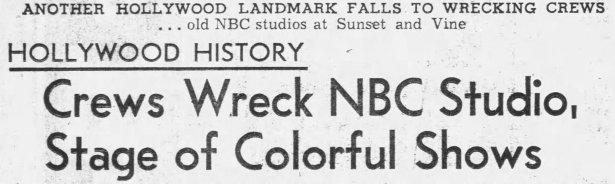 In September 1937, the owner of a rival drive-in restaurant across the street on the southeast corner of Sunset and Vine (6290 Sunset) had the existing buildings demolished and removed. The following month, Carpenter’s applied for permits at 6290 Sunset. NBC was ready to start construction on its new home by the end of October 1937.